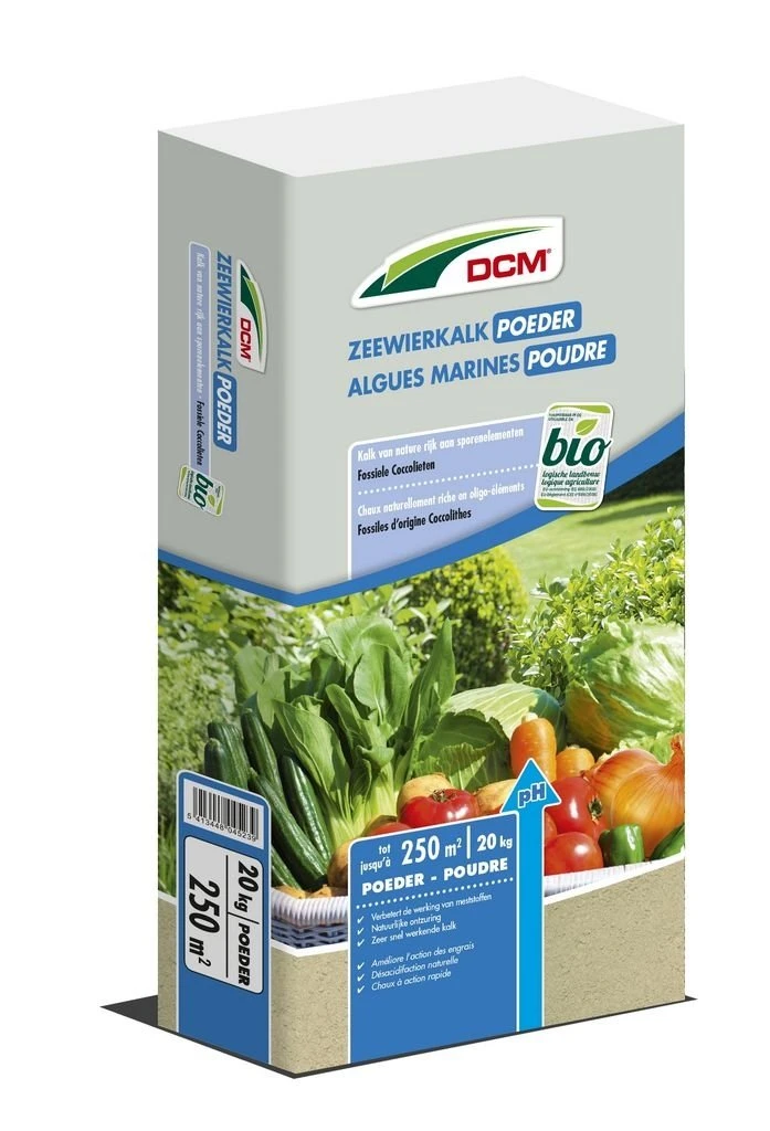 Deze zeewierkalk in fijne poedervorm heeft een zachte werking en snelle oplosbaarheid. Voor het bekalken van moestuin, siertuin, boomgaard, vijver en composthoop. Toepasbaar in de biotuin.