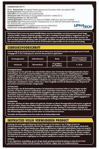 KB Muizen Lokdoos Pasta ‘Generation Pat’ is een zeer aantrekkelijk lokaas voor het bestrijden van huismuizen in zowel droge ruimtes (zolder, vloeren, plafonds, garages, etc.) als in vochtige ruimtes (kelders, magazijnen, etc.). Het gif zal de muis na enkele dagen doden zodat er geen argwaan wordt gewekt bij de andere muizen. De kant-en-klare lokdozen bevatten ieder 25g pasta. De zakjes niet openen, de muizen eten hier doorheen. Het aantal lokdozen is afhankelijk van de te behandelen oppervlakte en de omvang van de plaag.