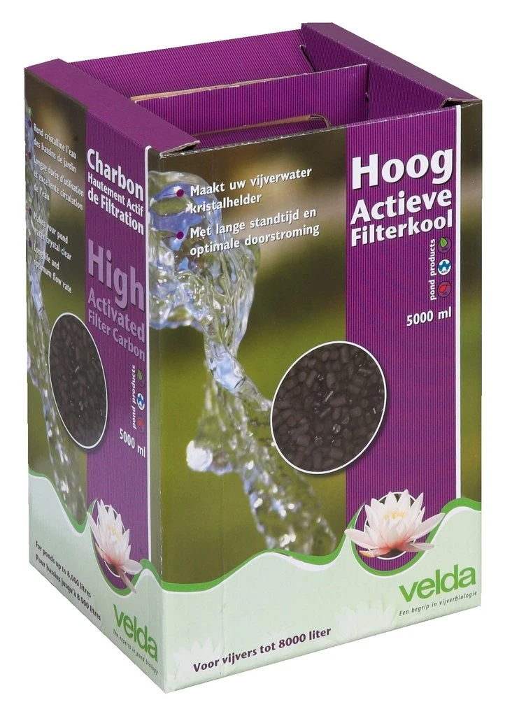 Hoog Actieve Filterkool is een bijzonder filtermedium voor het verwijderen van organisch vuil, geur- en kleurstoffen. Het is vervaardigd uit hoog actieve koolstof en tot staafjes samengeperst. Daardoor verkrijgt het materiaal een bijzonder goede doorstroming en zorgt het voor kristalhelder water. Deze Hoog Actieve Filterkool is geschikt voor het filteren van vijverwater en kan in elk vijverfilter worden gebruikt.Door de lange standtijd is het ook ideaal voor biologische filtratie. Zowel mechanisch als biologisch wordt het water met deze Hoog Actieve Filterkool dan ook perfect gezuiverd en kristalhelder.Filtratie van het vijverwater kan zowel langs mechanische als biologische weg. De werking van mechanische filtratie berust op het verwijderen van organische en anorganische vuildeeltjes evenals geur- en kleurstoffen. Het principe van biologische filtratie is om door middel van micro-organismen een betere en snellere omzetting te verkrijgen van organische bestanddelen. De Velda filterwatten en filterkool materialen staan garant voor een uitstekende waterfiltratie. Filtermaterialen bepalen de kwaliteit van het filter Niet het filter, maar de filtermaterialen bepalen de kwaliteit van de filtratie. Mechanisch filtermateriaal houdt het vuil tegen, maar kan geen afvalstoffen afbreken. Biologische filtermaterialen zetten de afvalstoffen wel om, maar houden het vuil niet tegen. Daarom is een combinatie doorgaans het beste. Bijvoorbeeld als volgt:Watten of filterschuim dat grove vuildeeltjes verwijdert;Actieve vijverkool, dat geur- en kleurstoffen absorbeert;Dragermateriaal voor de aanhechting van micro-organismen, zoals keramische filterpijpjes.
