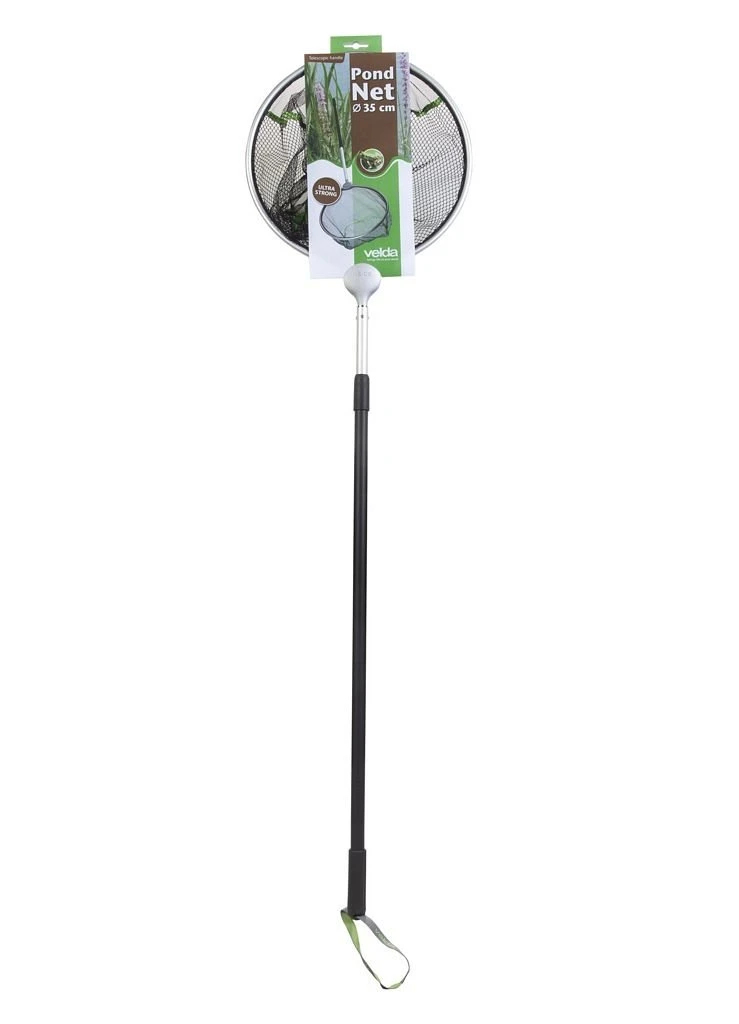 Het Pond Net assortiment van Velda bestaat uit diverse soorten en maten schepnetten en zijn inclusief een telescopische steel. De netten zijn op een bijzondere manier en onzichtbaar in het frame verwerkt. Daarmee is er een zeer goede verbinding verkregen tussen het netmateriaal en het frame, terwijl daarmee netbeschadiging tot het verleden behoort. De opvallende groene belijning in het net bevordert de zichtbaarheid tijdens het gebruik in de vijver. De steellengte is 180 cm.De Daphnia netten zijn fijnmazig en zijn uitermate geschikt om zelfs de kleinste vuildeeltjes uit het water te verwijderen, zoals stuifmeel en kleine takjes/bladeren. De grofmazige netten zijn geschikt voor het uitzetten en vangen van vissen, maar ook voor allerlei klusjes, zoals het verwijderen van bladeren. Kies de vorm die het beste past bij het gebruik; vierkant of 3-hoekig voor strakke vijvers, rond voor bijvoorbeeld natuurvijvers. Produkt Afmeting Kleur Pond Net Rond 35 cm zwart Pond Net Rond 46 cm zwart Pond Net Vierkant 35 cm zwart Pond Net Vierkant 46 cm zwart Pond Net Driehoek 40 cm zwart Pond Net Daphnia vierkant 35 cm wit Pond Net Daphnia rond 35 cm wit Bovenstaande afmetingen zijn verkrijgbaar