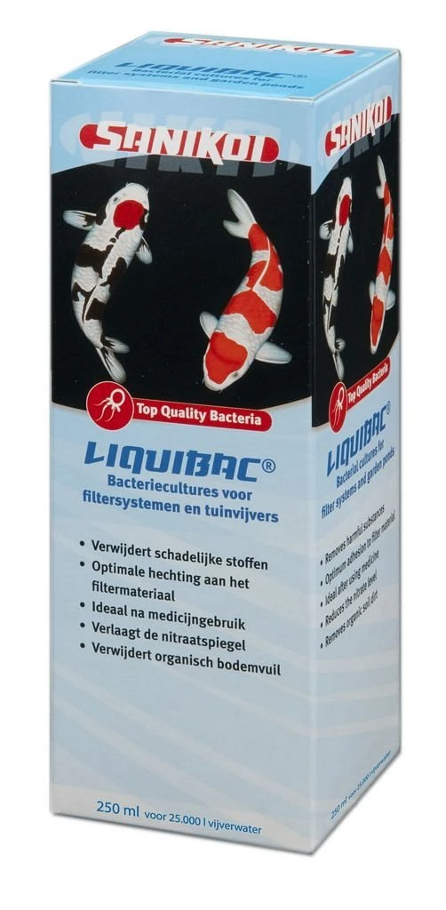 In nieuw geïnstalleerde filtersystemen en/of pas aangelegde vijvers kan het wel vier tot zes maanden duren voordat de micro-organismen en bacteriën zich voldoende hebben vermeerderd en er sprake is van een evenwichtig milieu. Met SaniKoi LiquiBac kunt u deze termijn aanmerkelijk verkorten. De in vloeistof aanwezige bacteriën “Bacillus Spp”, kunnen eenvoudig aan het filtermateriaal worden toegevoegd.Leverbaar in verpakking van 250, 500 en 1000 ml.Een uitstekende manier is om naast het filtermateriaal ook een dosis LiquiBac direct in de vijver te gebruiken. Bij voldoende aanbod van organisch materiaal ontstaan er binnen 48 uur ongeveer twee en half miljard bacteriën per dosis van 25 ml. Deze zorgen ervoor dat er snel een natuurlijk evenwicht in de vijver ontstaat en in het bijzonder, dat de nitraatspiegel binnen een aanvaardbaar niveau blijft.SaniKoi LiquiBac:Verwijdert schadelijke stoffen.Hecht zich optimaal aan het filtermateriaal.Is ideaal na medicijngebruik.Verlaagt de nitraatspiegel.Verwijdert organisch bodemvuil.